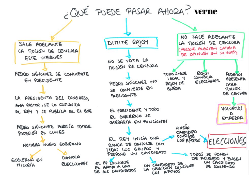 El Congreso de los Diputados está debatiendo la moción de censura a Mariano Rajoy presentada por el PSOE. Después de que el PNV haya anunciado que dará sus votos a Pedro Sánchez, a los socialistas les salen las cuentas para llegar a los 176 votos necesarios para la mayoría absoluta... Si no hay sorpresas de última hora. Sería la primera vez que una moción de censura fuerza la salida del Gobierno en España. Estos son los tres escenarios posibles que se manejan en estos momentos. Una especie de "elige tu propia aventura" para Mariano Rajoy.