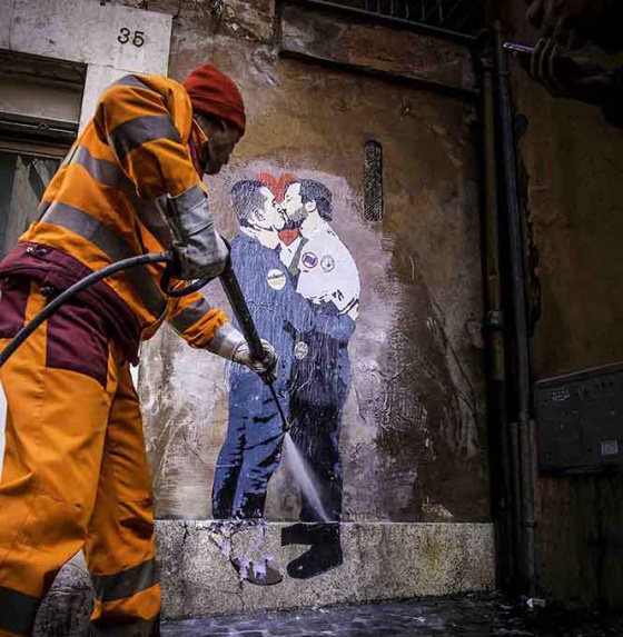 La censura de otro de sus besos, el de Salvini y Luigi Di Maio (líder del Movimiento 5 estrellas) en Roma disparó su interés en los medios. Salvatore Benintende y 5 personas de su equipo la crearon durante la noche y, a las 7 de la mañana, un carabinero ya la había tapado con cajas de cartón, lo que atrajo la atención de la prensa. Pocas horas después ya la estaban borrando, pero también se había viralizado en redes sociales, también por lo accesible de su mensaje.